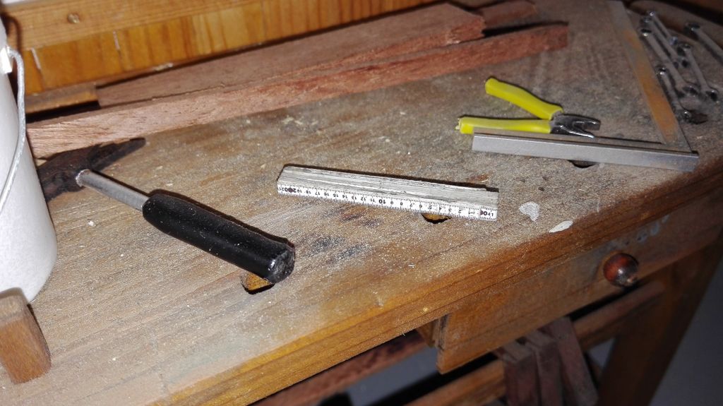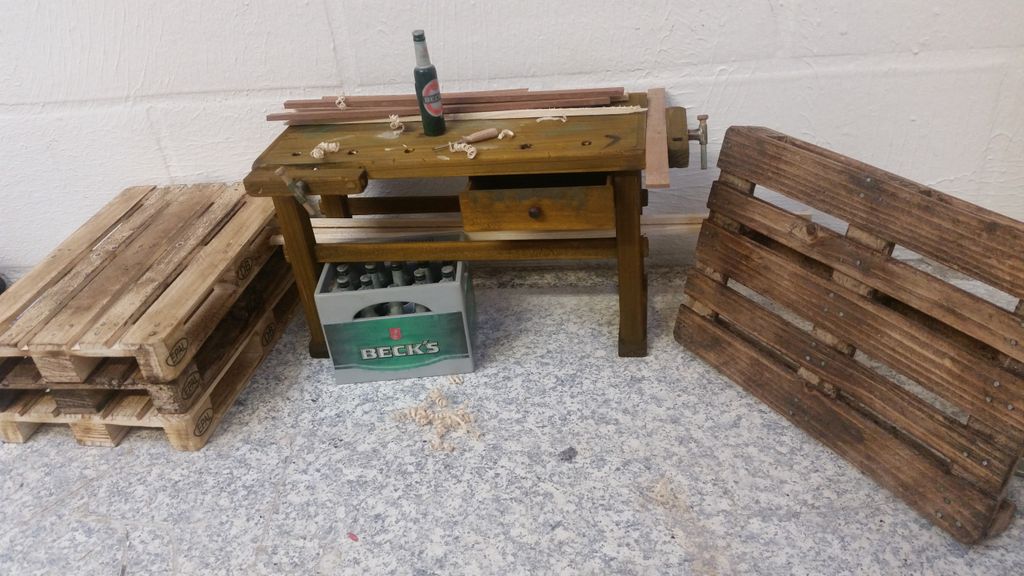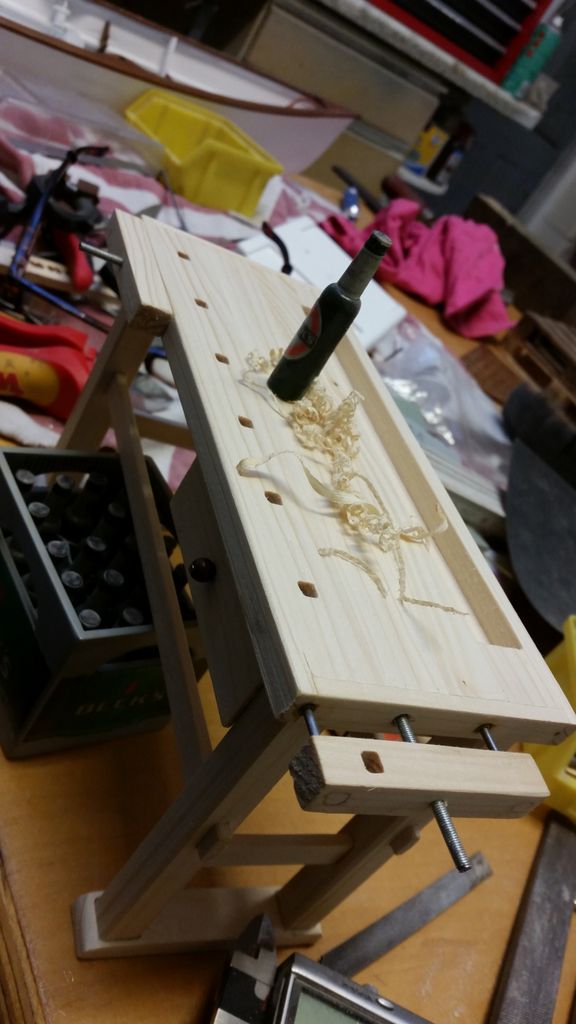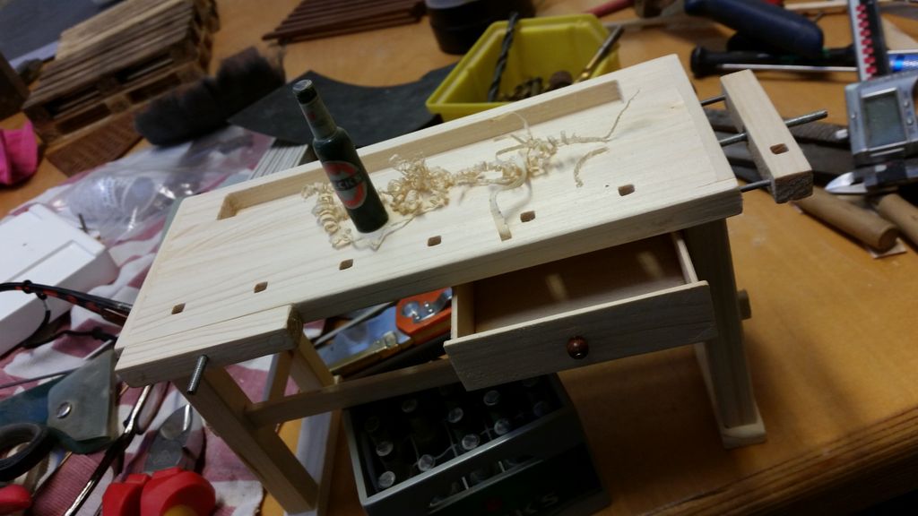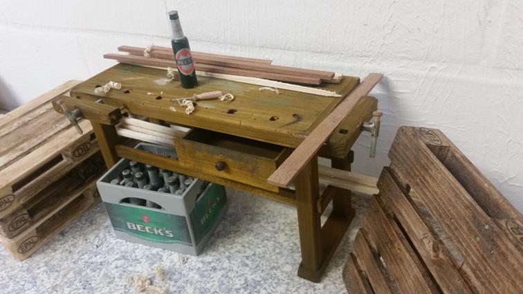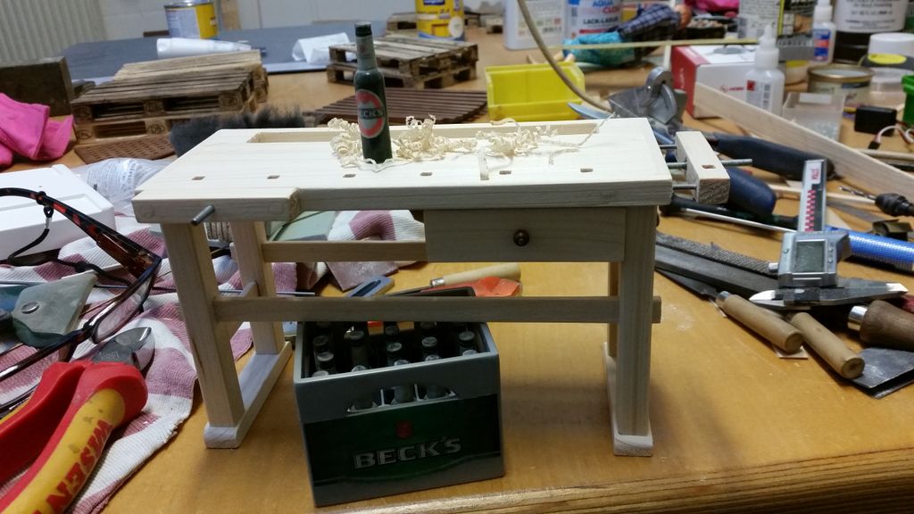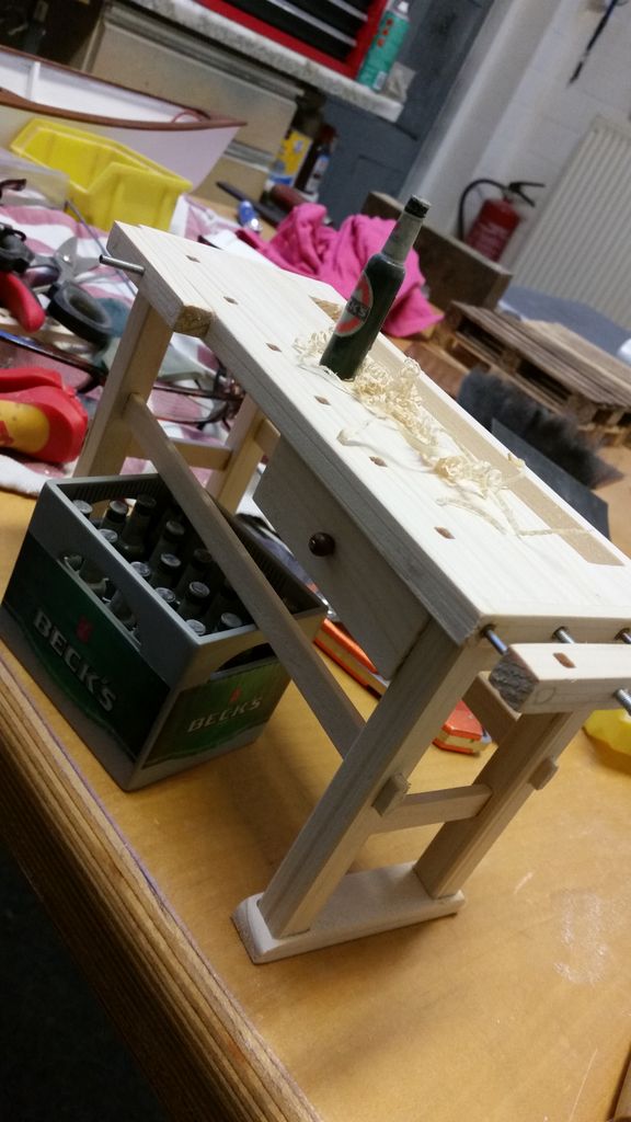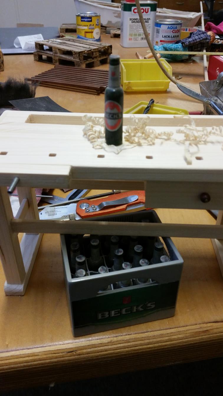 So, das wäre geschafft! Als nächstes kribbelte es, eine Hobelbank zu erschaffen; immerhin leichter als ein Schraubstock. Der Bierkasten gehört hier eigentlich nicht hin, er ist im Maßstab 1:5 und für ein anderes Boot verplant.