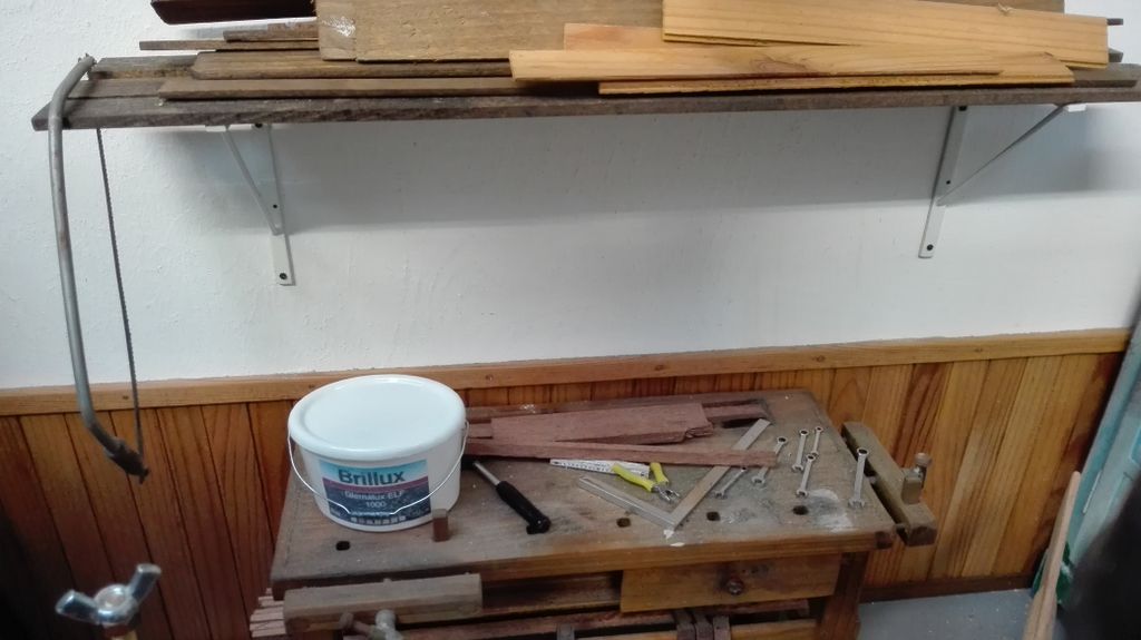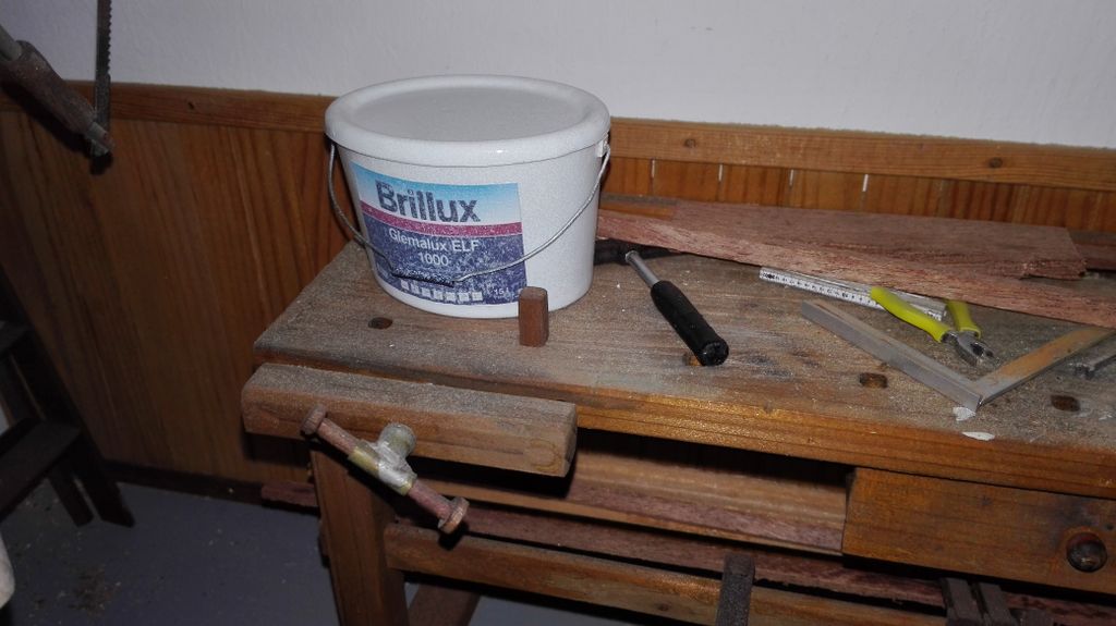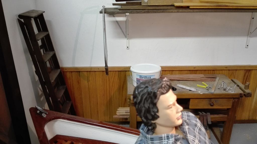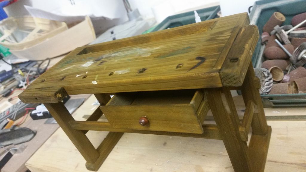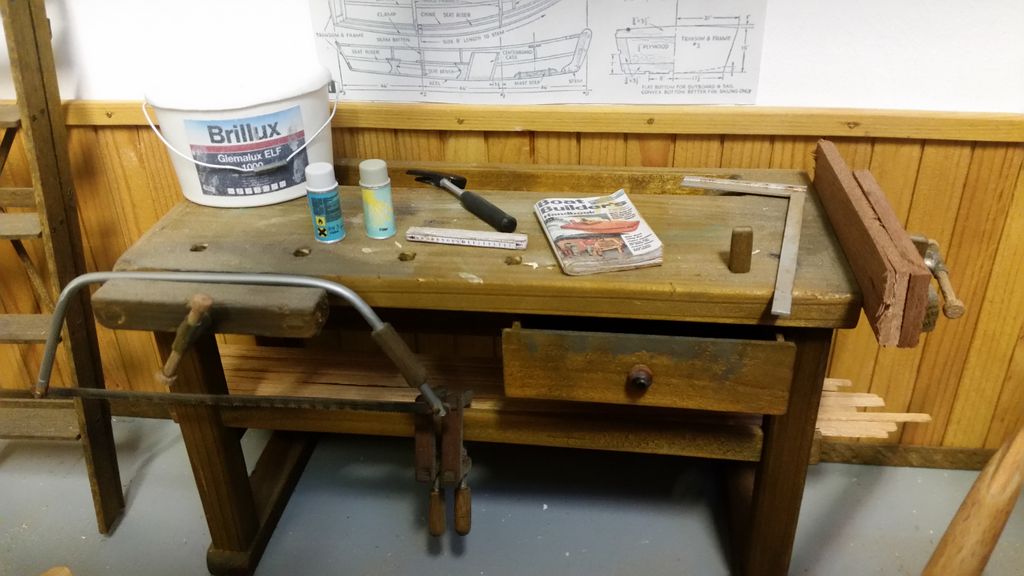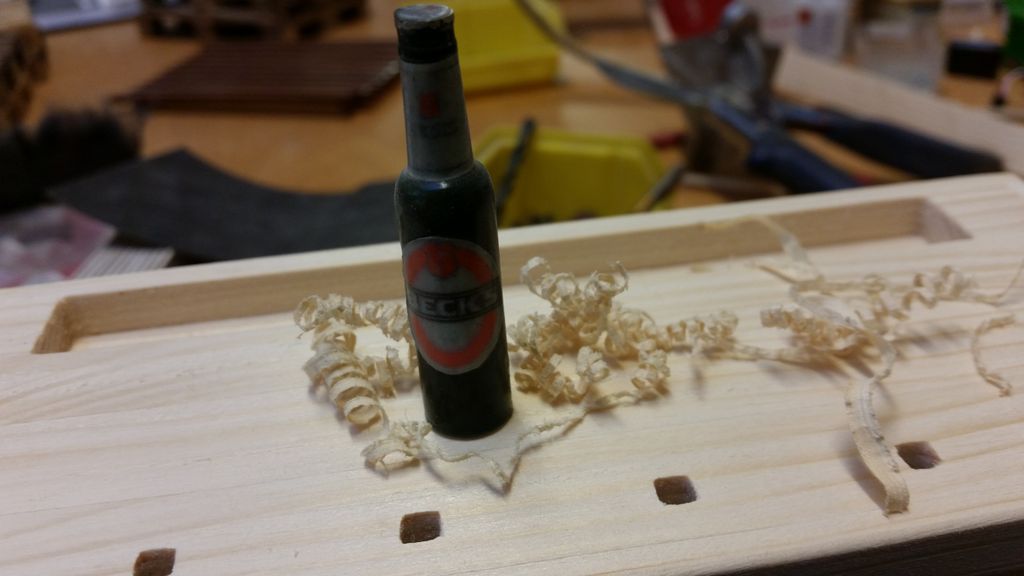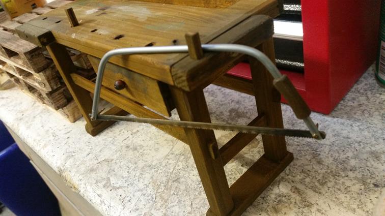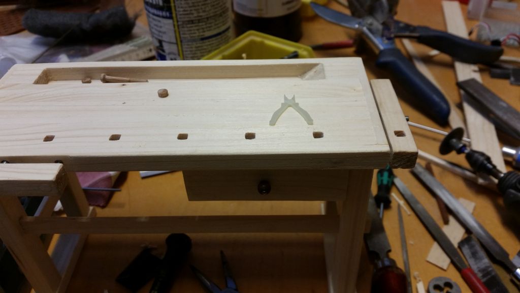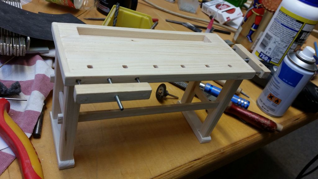 So, das wäre geschafft! Als nächstes kribbelte es, eine Hobelbank zu erschaffen; immerhin leichter als ein Schraubstock. Der Bierkasten gehört hier eigentlich nicht hin, er ist im Maßstab 1:5 und für ein anderes Boot verplant.