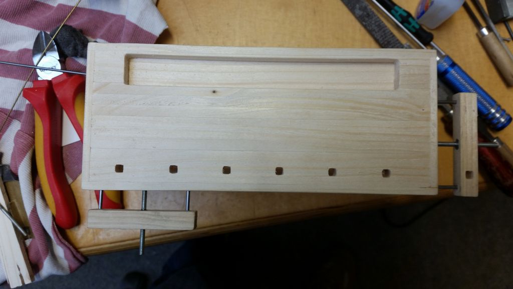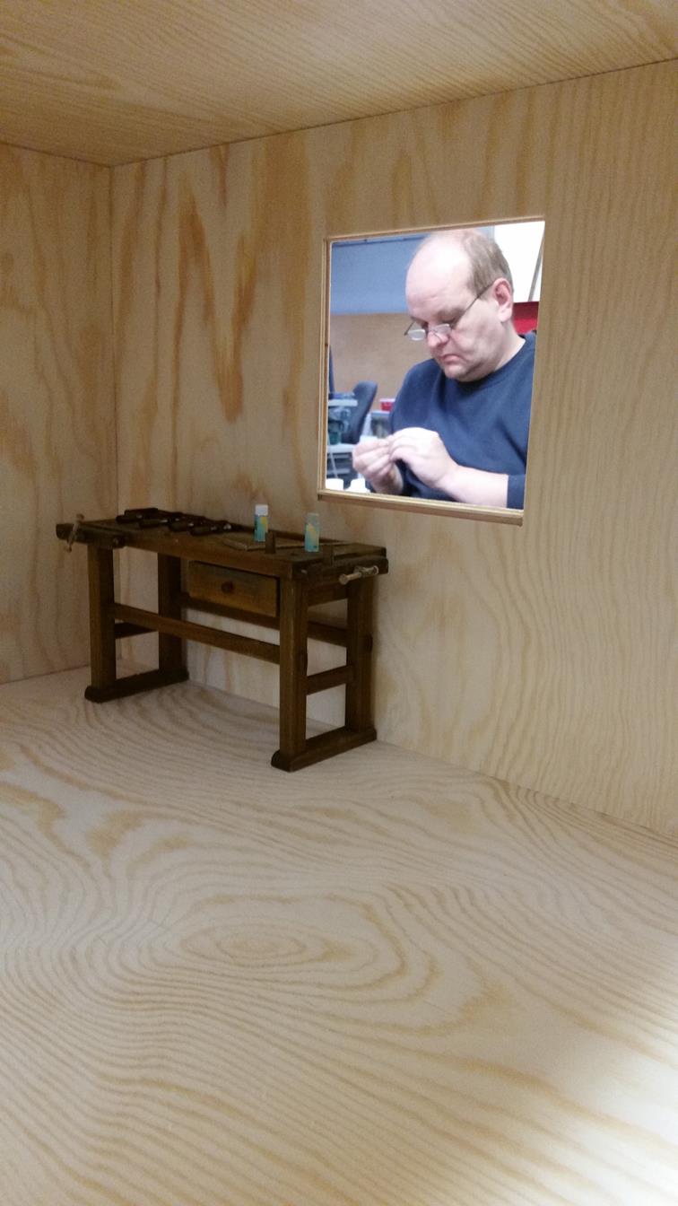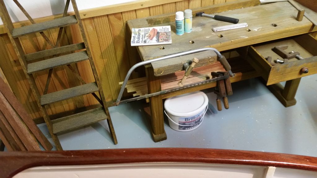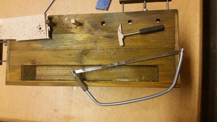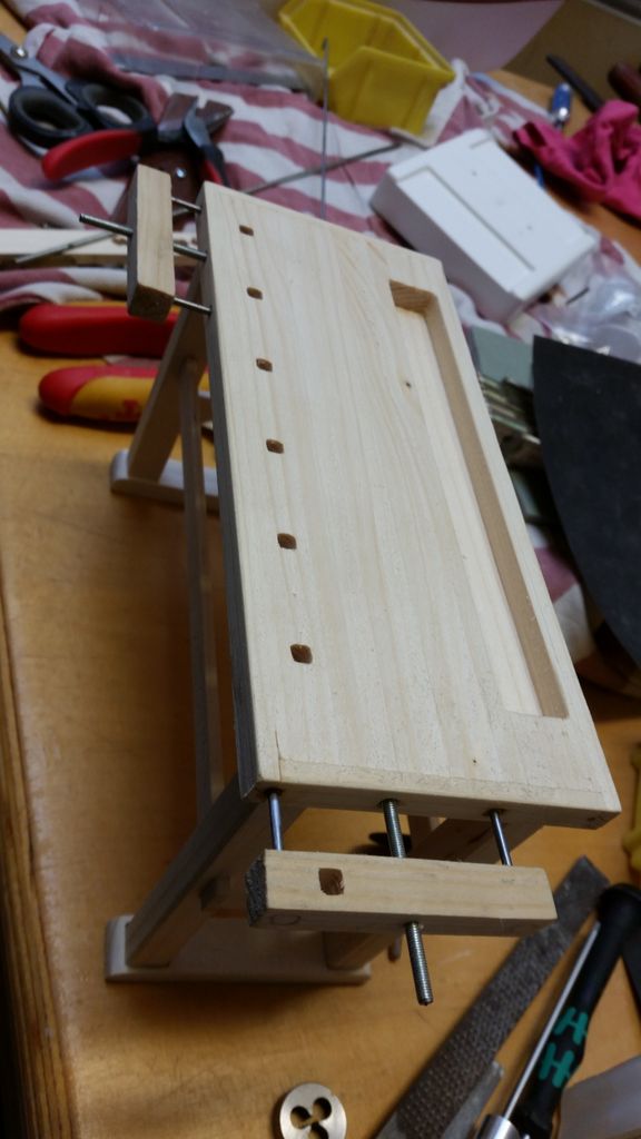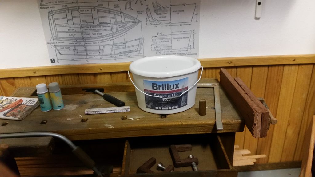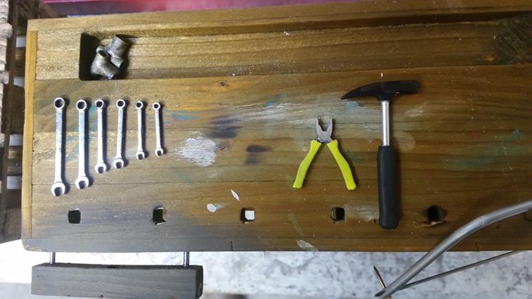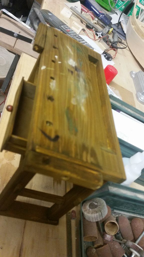 So, das wäre geschafft! Als nächstes kribbelte es, eine Hobelbank zu erschaffen; immerhin leichter als ein Schraubstock. Der Bierkasten gehört hier eigentlich nicht hin, er ist im Maßstab 1:5 und für ein anderes Boot verplant.