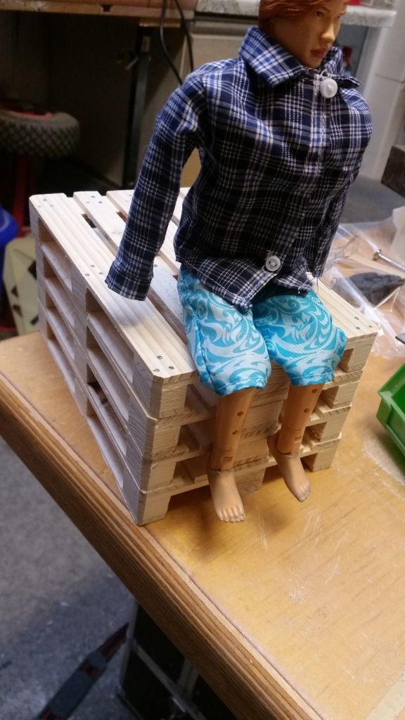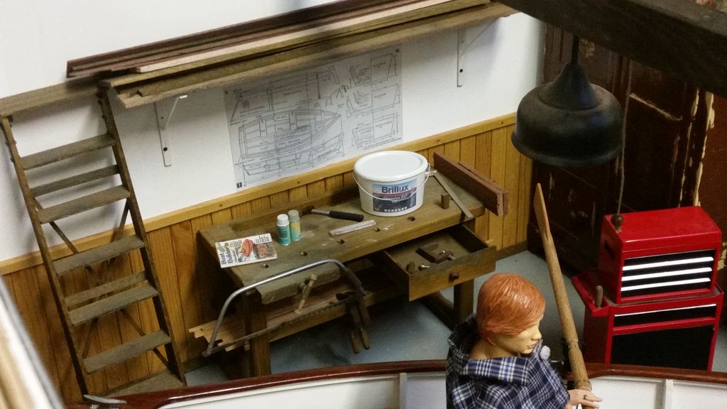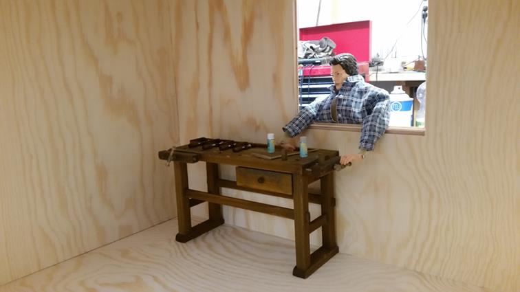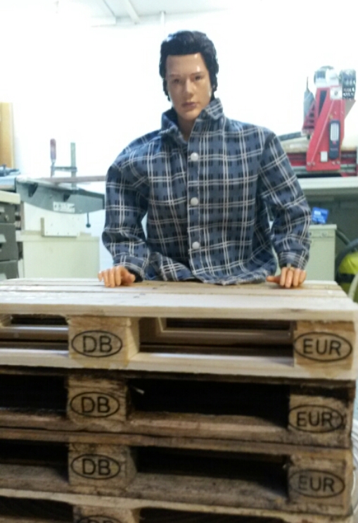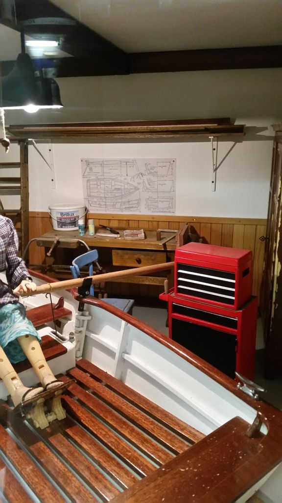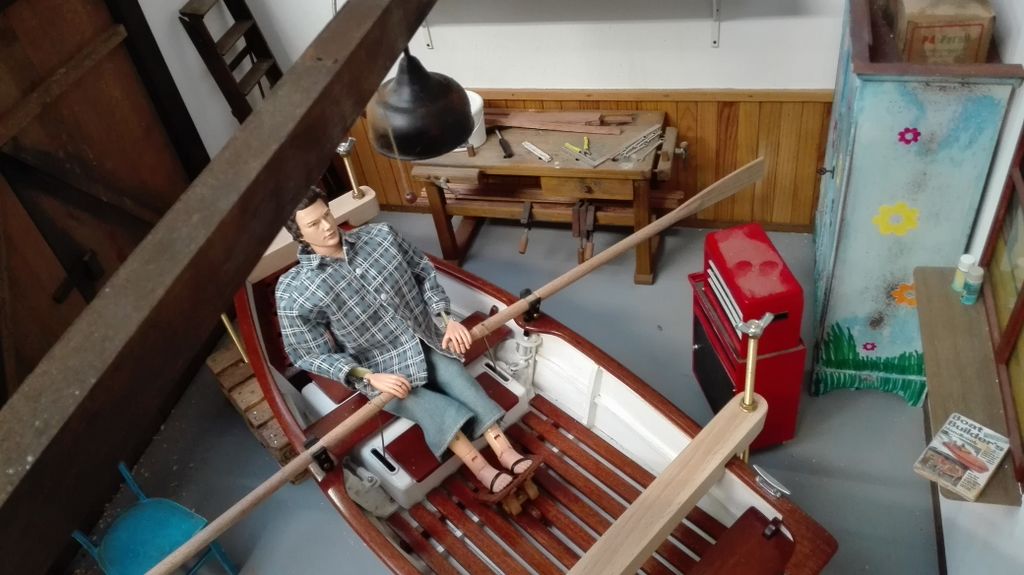 Aber wer sollte das Boot steuern? Ken? Nee, der ist deutlich zu steif. Eine Fantasiefigur kam erst recht nicht in die Tüte. Die Wahl fiel letztlich auf die „wilden Kerle“. Nicht so steif wie Ken und recht realistisch im Design. Der arme Kerl musste sich allerdings zahlreichen Operationen unterziehen, bis neue Arme und mehr Bewegung im Oberschenkel waren. Jetzt hat’s gepasst. Problematisch war nur noch der Maßstab. Die wilden Kerle als Teenager passen für uns am Besten in den Maßstab 1: 6,5. Dem Boot war es egal, uns auch, den wilden Kerlen sowieso! Die Ruder haben wir an einem Stück gelassen, da ein Teilen die Optik zerstört hätte. Aber wie transportiert man ein Ruderboot, an dem rechts und links die Ruder heraushängen? Eine entsprechend große Transportkiste musste her. Gesagt, getan, gewerkelt. Da stand sie, unsere grooooooße Kiste mit einem kleinen Ruderboot; nur wegen der blöden Ruder! Die Lösung lag allerdings auf der Hand: da in der Kiste noch jede Menge Platz neben den Rudern war, wurde kurzerhand eine Werkstatt daraus. Ich möchte es nicht als Diorama bezeichnen, da wir keine Werkstattszene nachbilden wollen, sondern lediglich den vorhandenen Platz ein wenig sinnvoller gestalten wollen. Etwaige Fehler zu einer „echten“ mögt ihr uns daher bitte verzeihen.